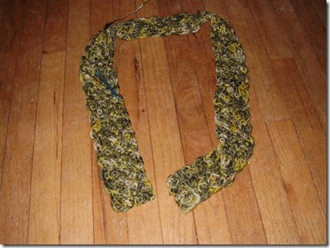 I like the look of the stitches. Especially since they travel the length of the scarf. It doesn't look so much like crochet. The popular opinion has been "why did you pick that color"? I'll see how wide it gets with 5 skeins.